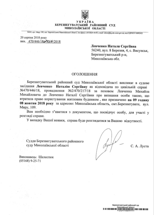 Оголошення про виклик до суду Левченко Наталю Сергіївну по цивільній справі №470/446/18